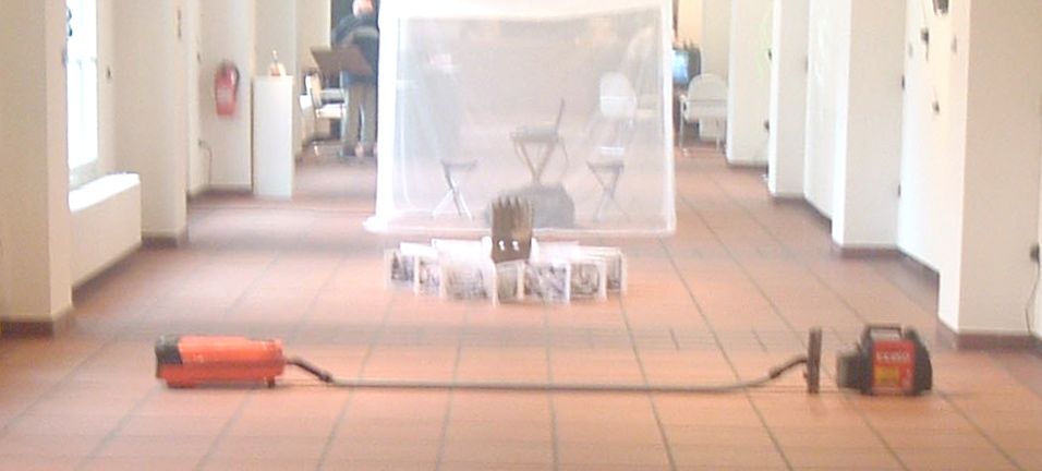 Generator, Benin 2005, 300 x 300 x 200 cm. Power generator, vacuum cleaner, air condition tubes, video projection