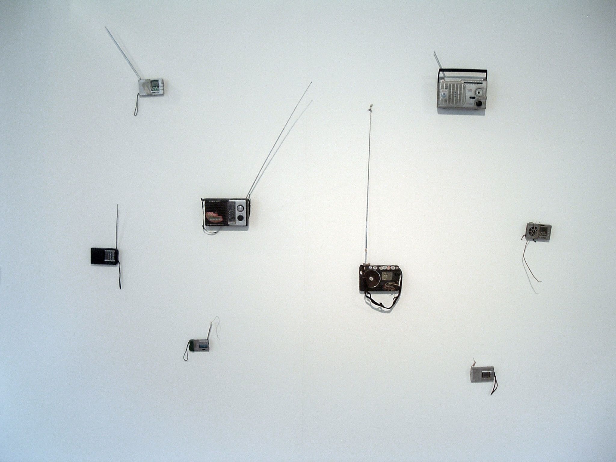 with new ones, a radio transmitter broadcasts recordings of the exchange process to the exhibited radios.