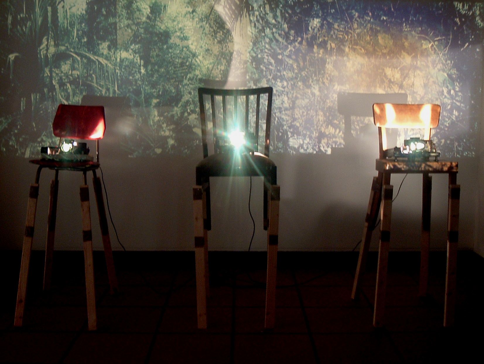 Highres, Installation, Ghana 2006, 500 x 400 x 250 cm. 6 used chairs and slide projectors without cases, pictures of rainforests.